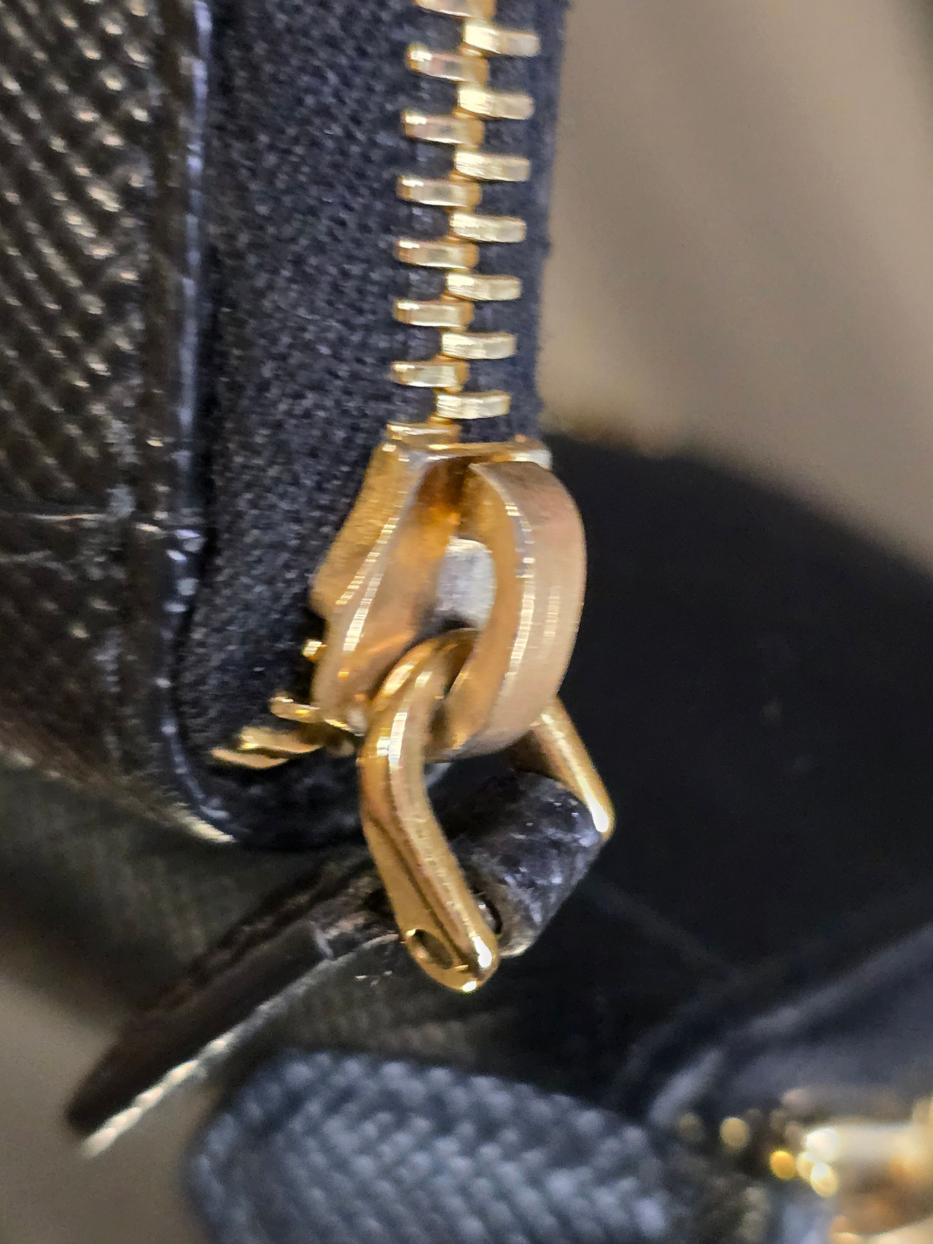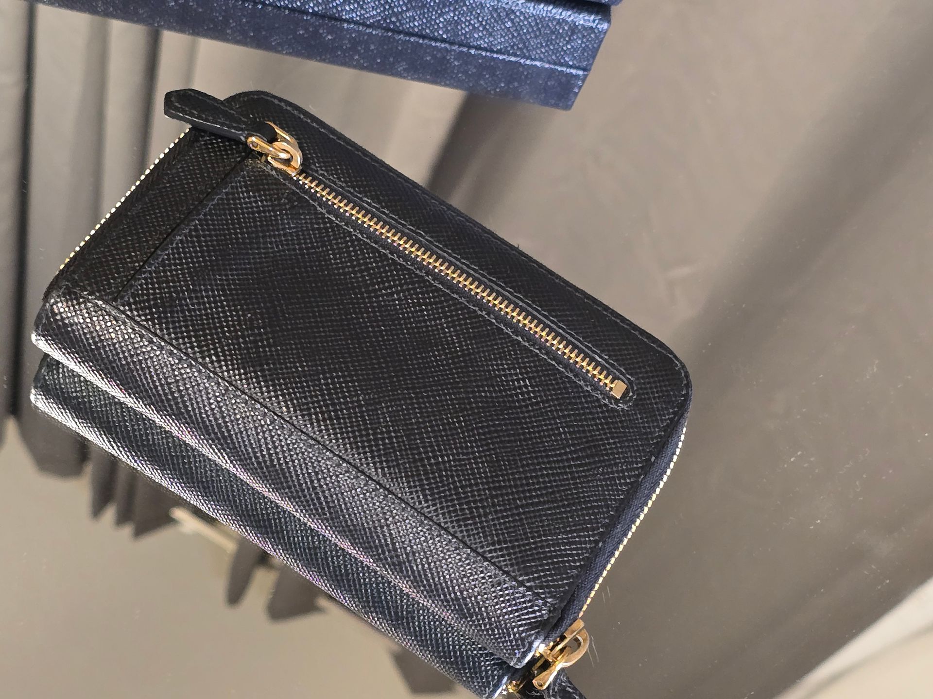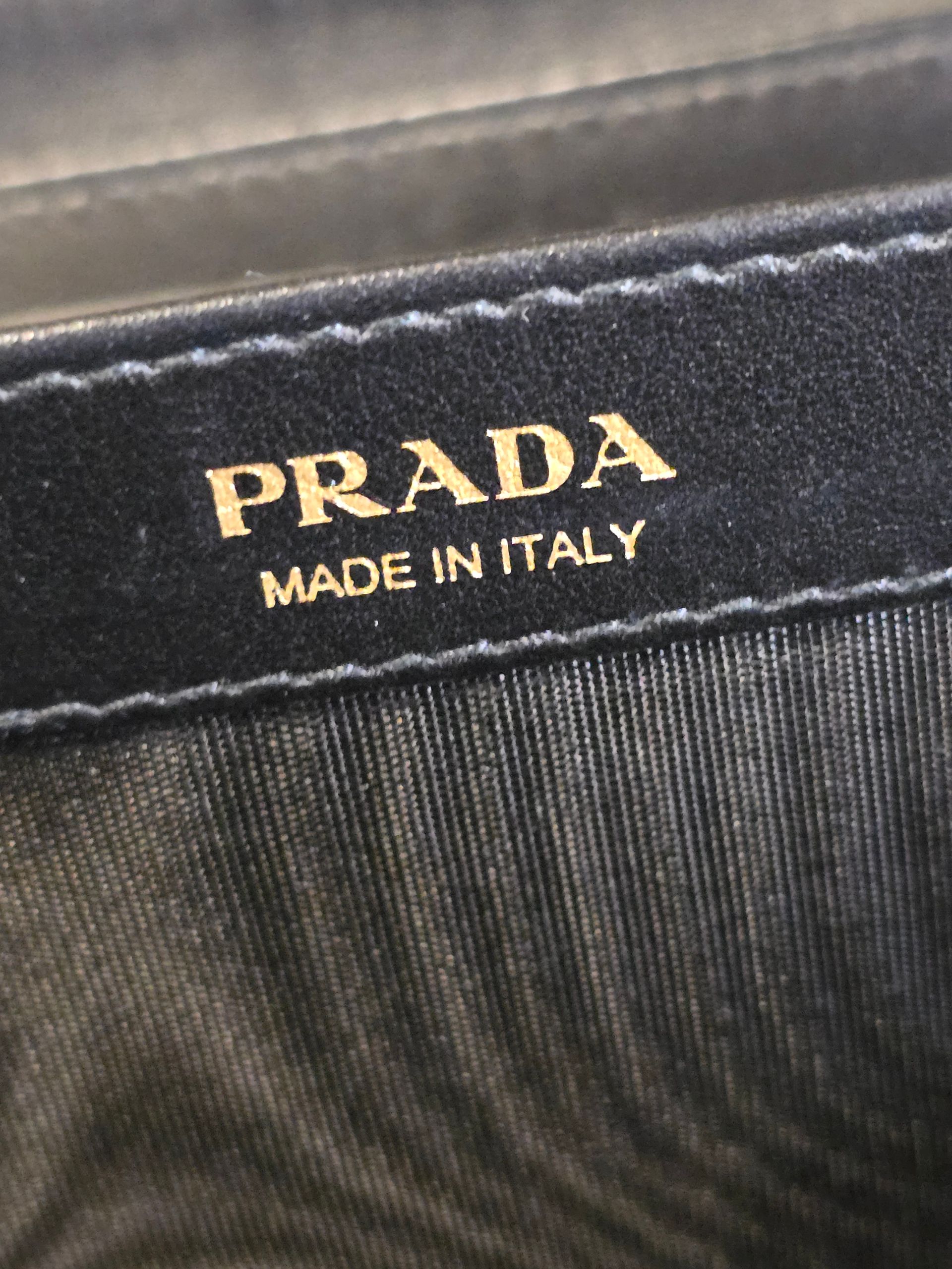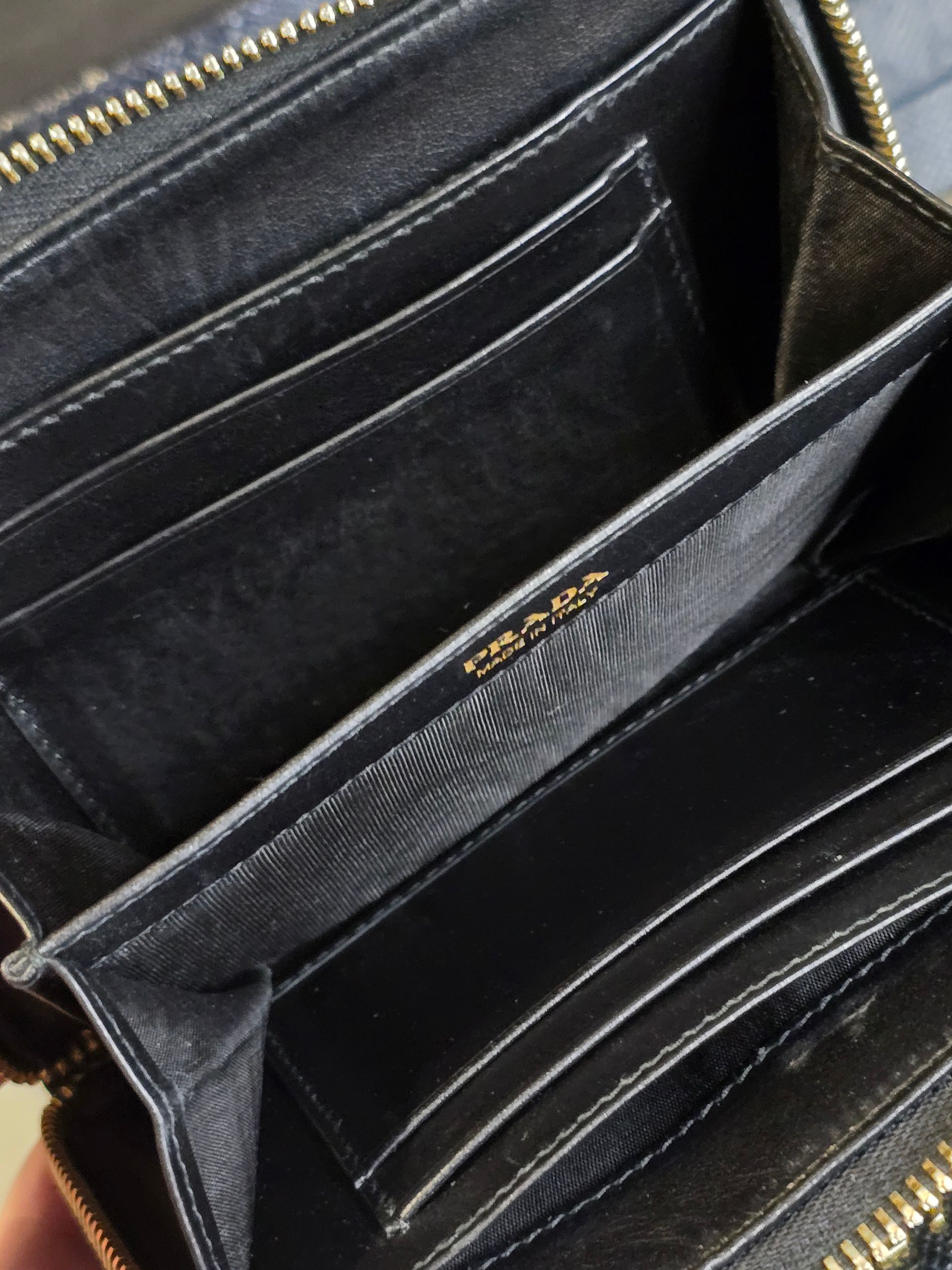 Features: Gold-finish Prada compact bifold design with a zip enclosure.